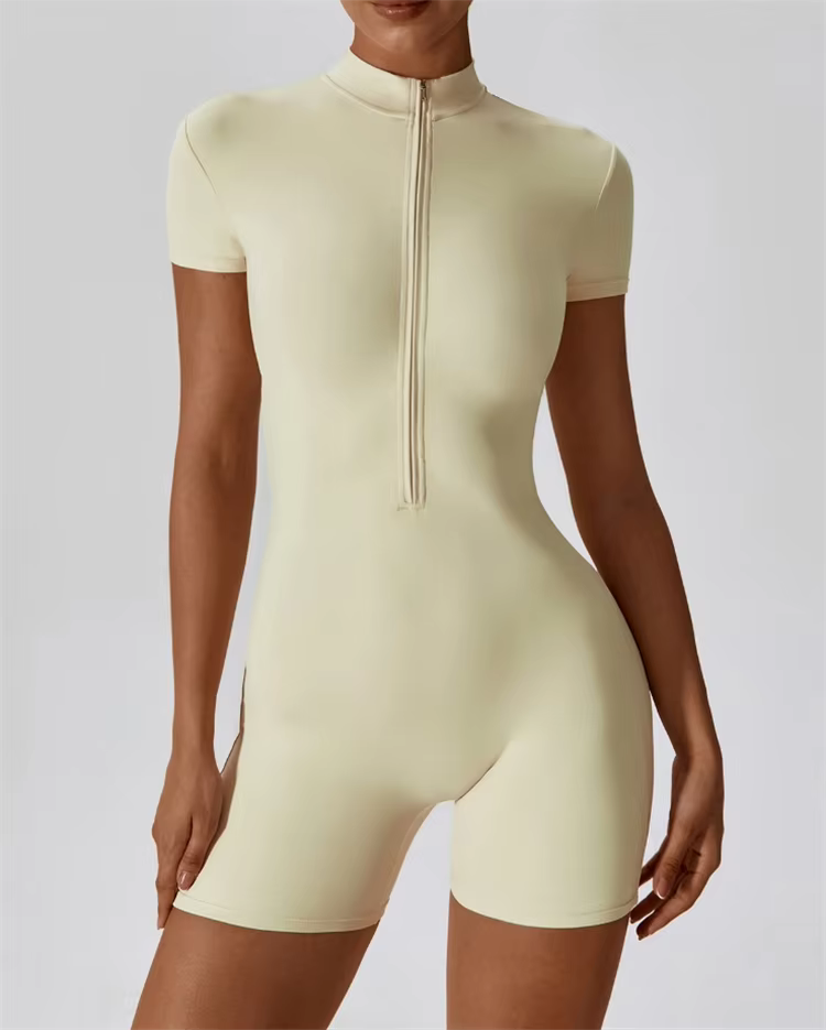 Dik Yakalı Yarım Fermuarlı Kısa Kollu , Tek Parça Gym Kıyafeti