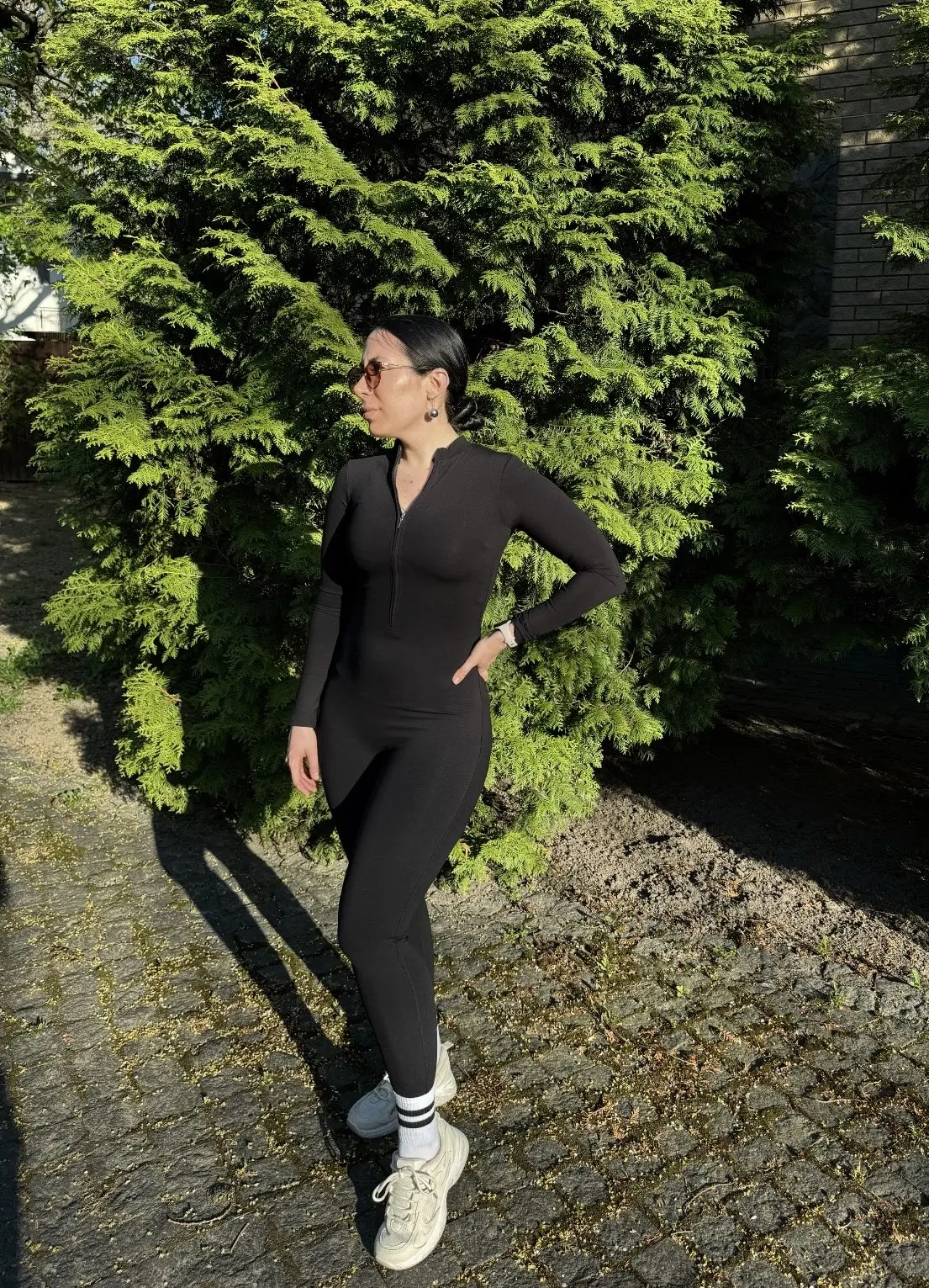 Tek Parça Fermuarlı Uzun Kollu Tulum Fitness Bodysuit